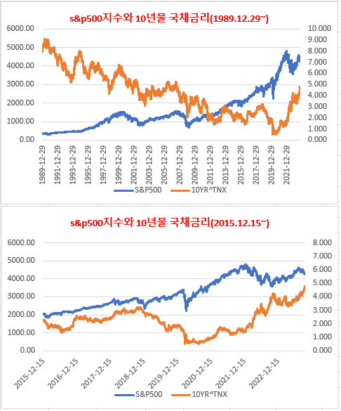 위 차트에서 s&p500지수와 10년물 국채금리 간에 유의한 상관이 있다고 보기보다는 때로는 동행하기까지 할 정도로 오히려 상관이 별로 없다고 보는 게 맞습니다.