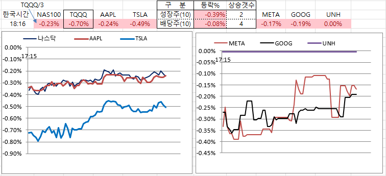 18:16분 경 올렸던 차트보다는 조금 더 하락한 상황이나 등락 종목수는 오히려 개선된 상황이고, 다만 장 마감후 실적을 발표하는 테슬라와 어제 낙폭이 컸던 엔비디아 등 두 종목이 조금 더 하락한 영향으로 지수가 더 하락한 듯 합니다.