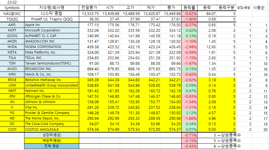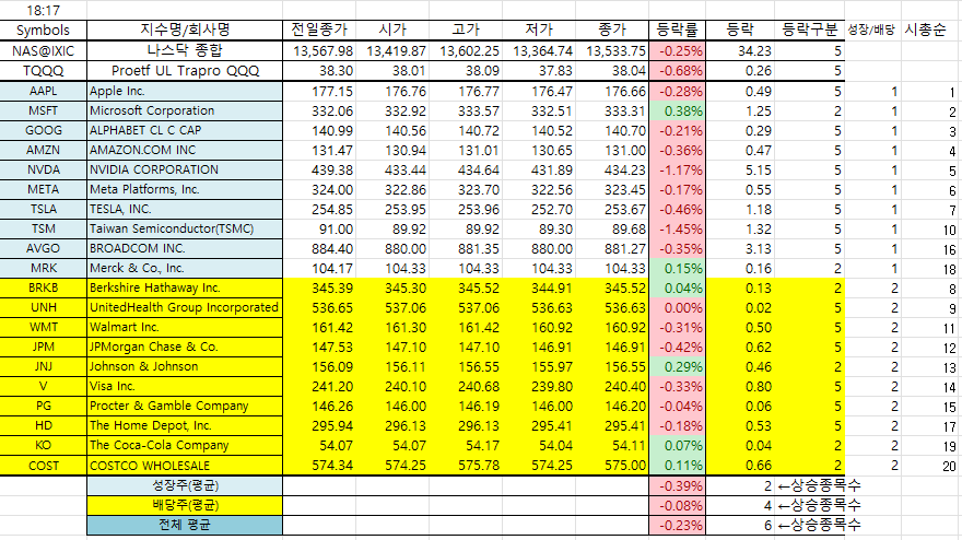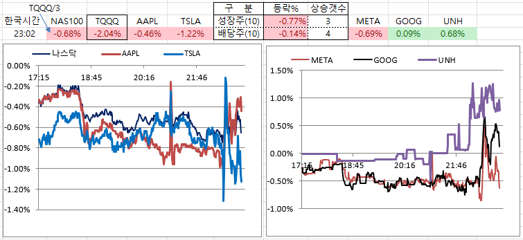 상승종목은 성장주와 배당주 공히 1개씩 증가했으나 테슬라와 엔비디아는 더 하락했습니다.