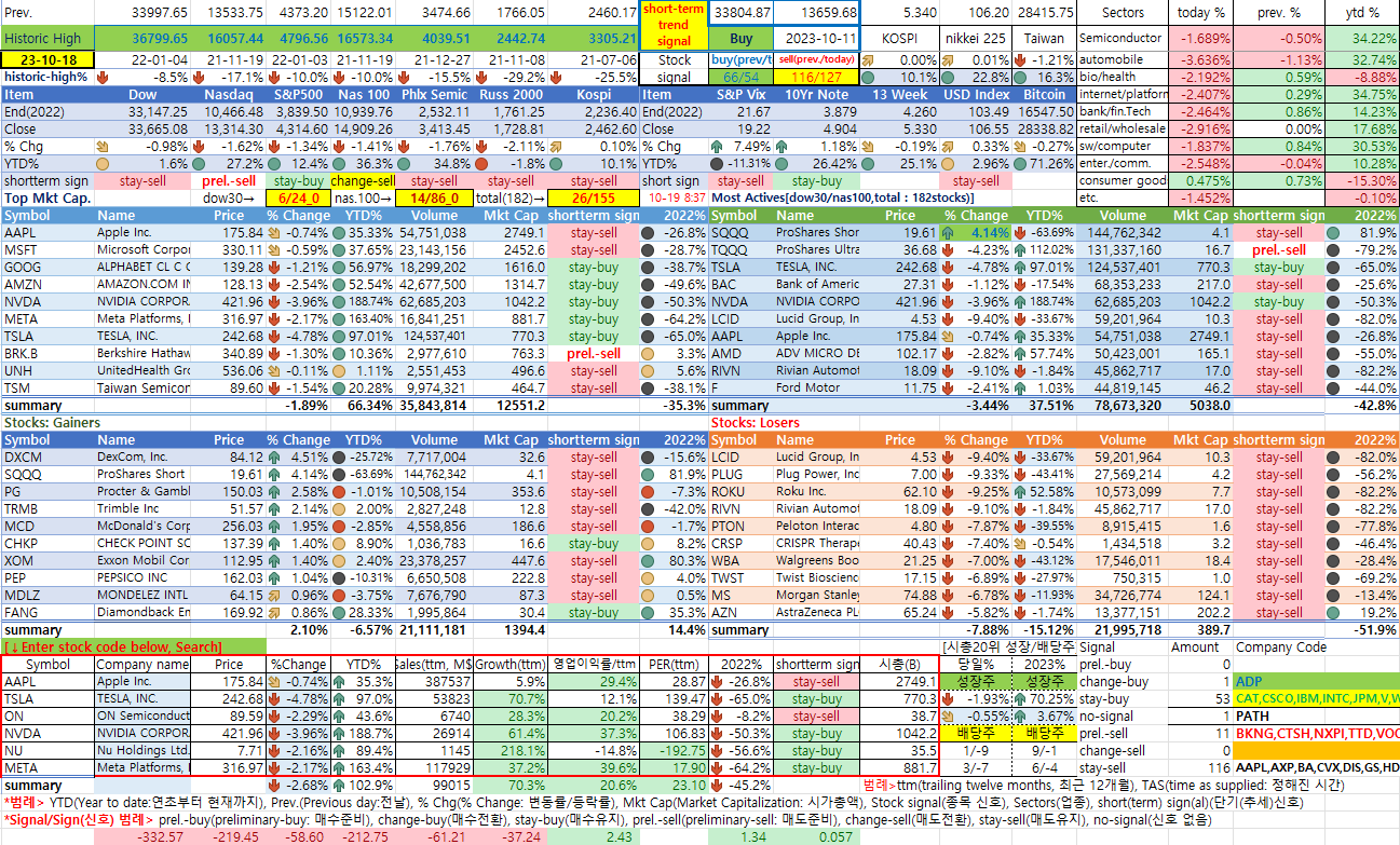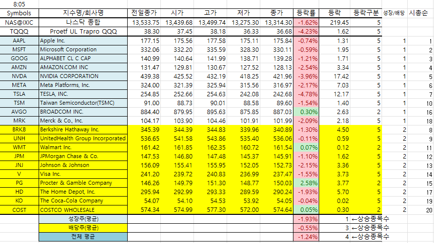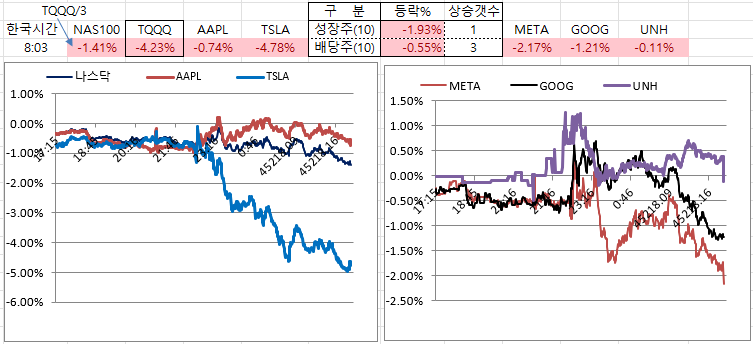 종목으로는 엔비디아가 전날(-4.68%)에 이어 이날 큰 폭의 하락(-3.96%)을 이어갔으며, 테슬라(-4.78%)의 예상된 어닝 쇼크가 크게 시장에 영향을 주기도 했습니다.
