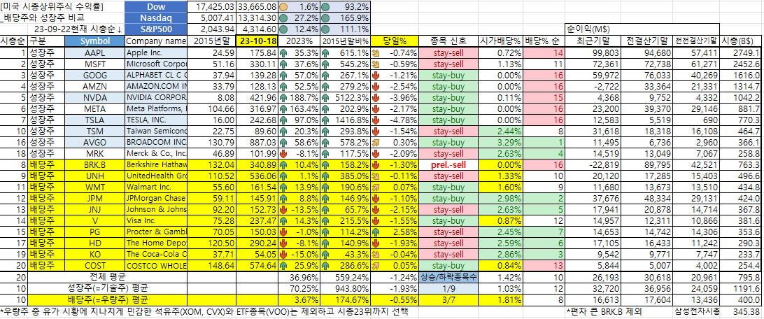 시총 상위권의 성장주와 배당주로 구분하여 보더라도 성장주 10개중 상승 1개로 평균 -1.93%로 대형주답지 않게 큰 폭 하락하였고, 배당주 역시 10개중 3개만 상승하면서 이날의 시장 분위기에 휩쓸린 바 있습니다.
