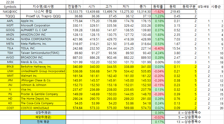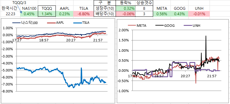 차트로는 테슬라의 낙폭이 워낙 큰 상황이어서 차트의 모습이 불균형적인 상황, 시세로 보면 시총 상위권의 성장주는 10개중 8개가 상승하고 있고, 배당주는 10개중 5개가 상승한 상황이어서 현재까지는 테슬라의 급락에도 시장이 나름 선방중인 것으로 판단됩니다.
