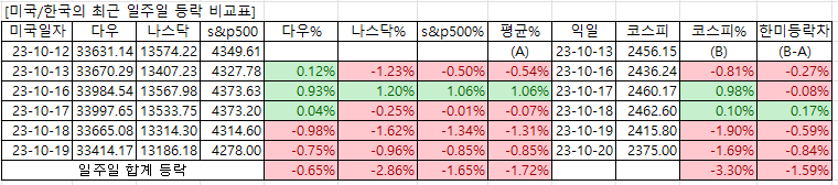 10.10일에 올렸던 저의 이전 글(미국주식 관점에서 한국주식 바라보기 (tistory.com))에서 지적했듯이 한국주식을 볼 때는 한국주식 관점에서만 볼 것이 아닌 것이 한국시장이 미국시장과 밀접한 관련을 맺고 있어, 최근 일주일 정도 기간의 등락을 비교하여 보면서 한국주식을 거래할 필요가 있다는 것입니다.