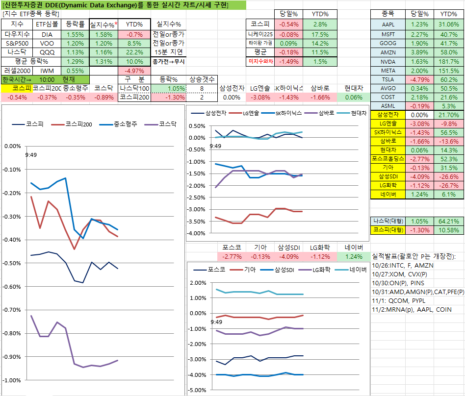 주말에 엑셀 파일의 리뉴얼 작업을 하면서 코스피 실시간 차트도 준비했는데, 오늘 코스피 장중 실시간 차트로 보면,