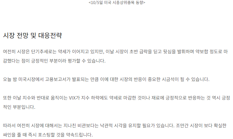 지수가 하락했음에도 VIX가 약세를 기록한 것이나 이날 나온 재료에 시장이 긍정적으로 나온 점이 시장에 긍정적인 부분이라 말씀드린 바, 이러한 전망이 바로 미국시장을 대응하는 중요한 팁이 될 수 있습니다.