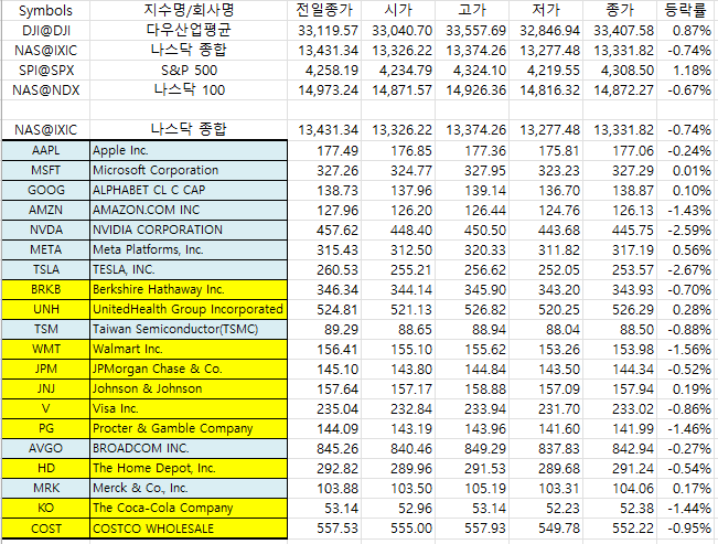 위 화면에서 다우와 S&P500지수는 전일 시세, 나스닥과 나스닥100지수는 15분 지연, 주식시세는 실시간 시세입니다. 개장초 급락으로 출발, 이 시각 현재는 종목별로 플러스로 전환한 주식들이 보이네요.