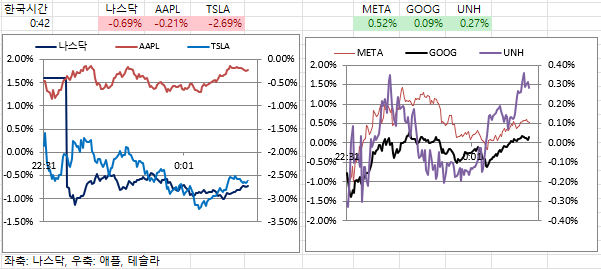 22:30분 이후부터 자동으로 그려주는데, 왼쪽 차트에선 나스닥 지수가 15분 지연이다 보니 좀 어색하군요.