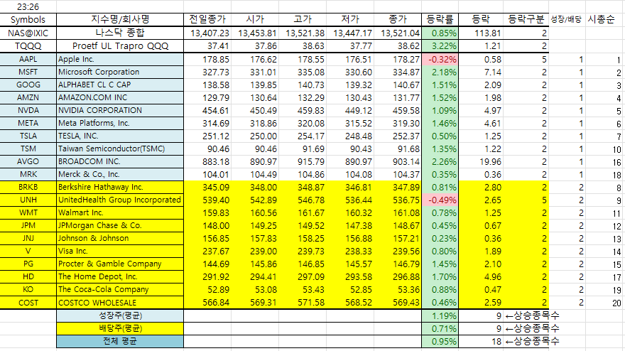 실시간 시세는 아래에서 보듯, 성장주와 배당주 공히 상승이 10개 중 9개로 동일하군요.