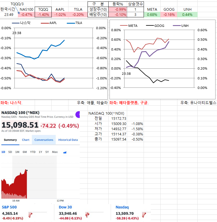 위 상황을 보면 나스닥100지수 기준 시가 -1.085출발후 최대 -1.58%까지 낙폭을 확대했다가 현재는 -0.5% 전후로 반등중입니다.
